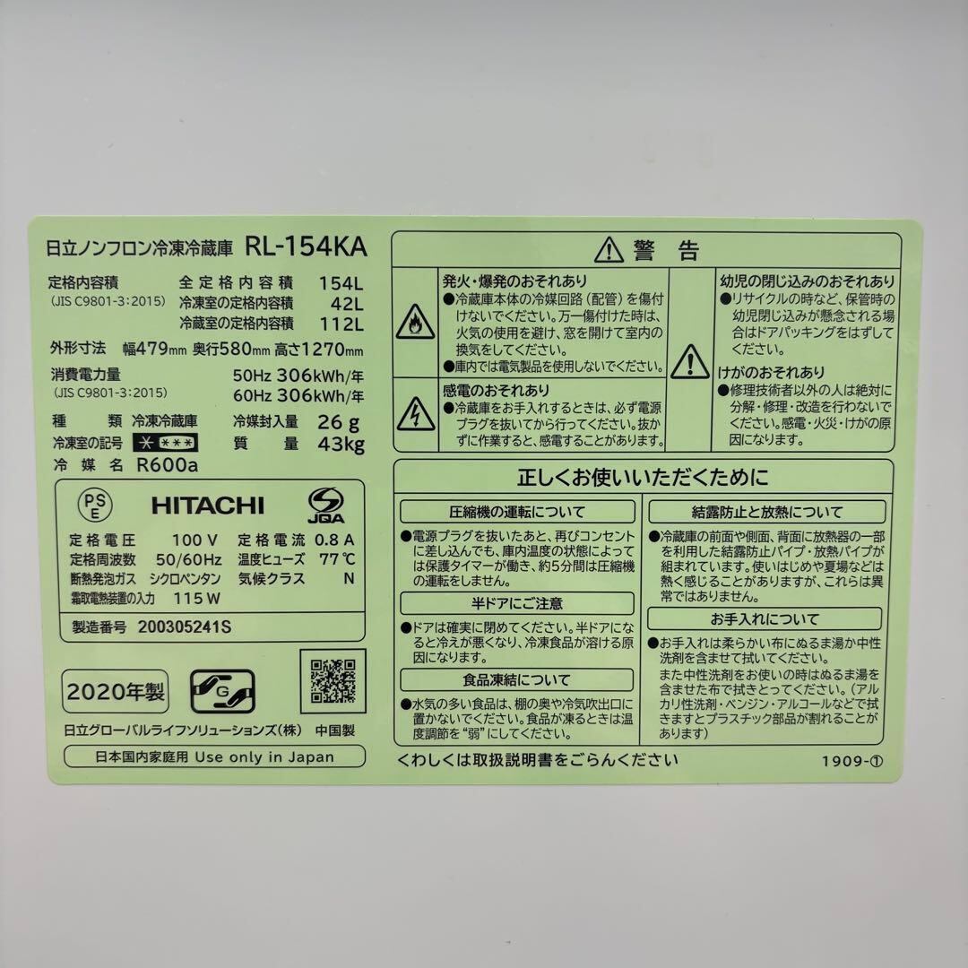 ⭐️HITACHI⭐️冷凍冷蔵庫 2020年 154L 大阪市近郊配送無料