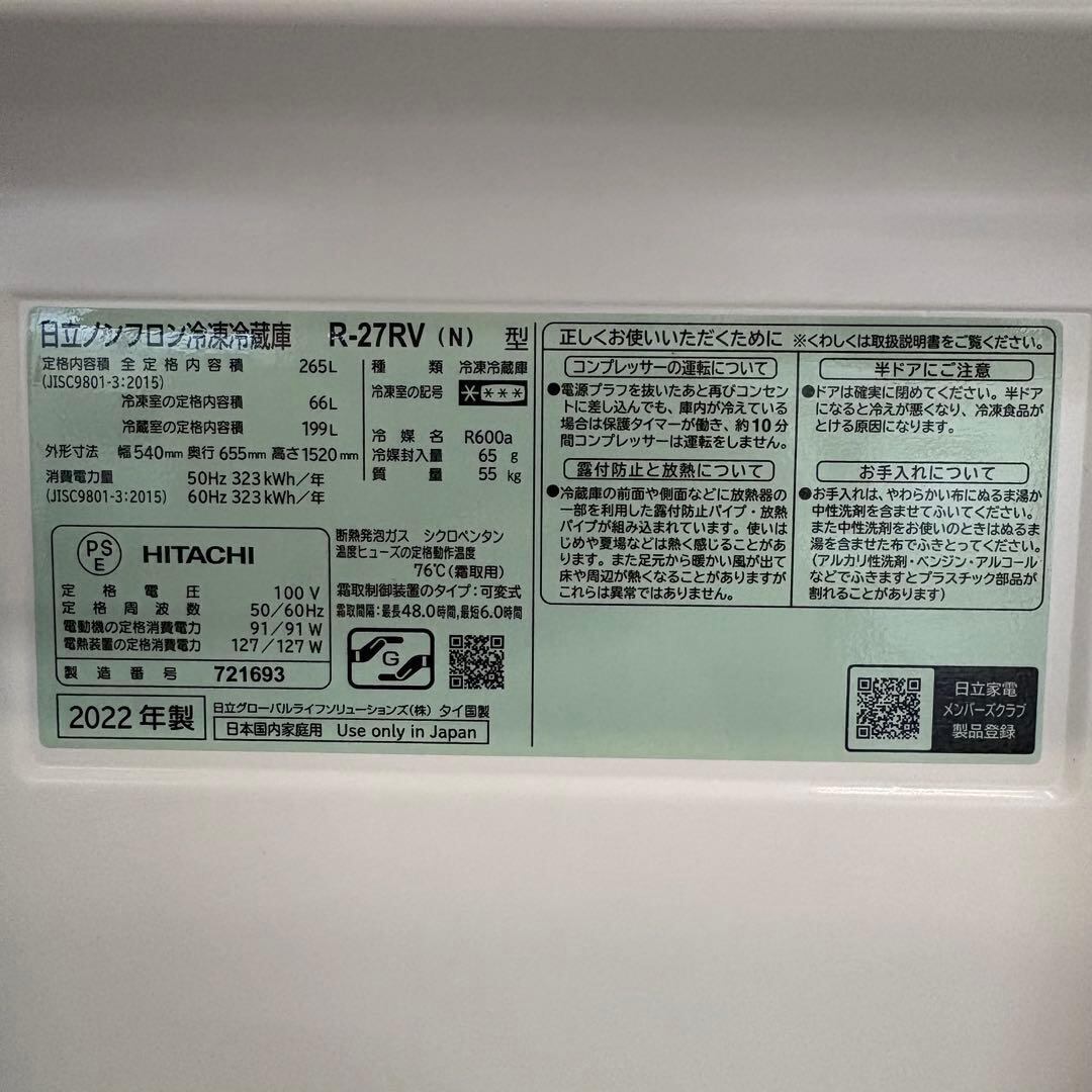 ⭐️HITACHI⭐️冷凍冷蔵庫 2022年 265L 大阪市近郊配送無料